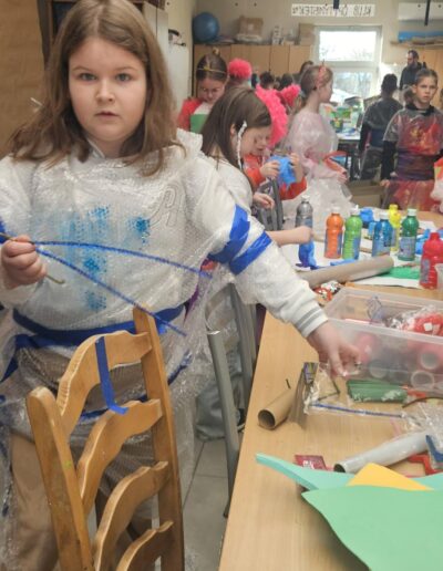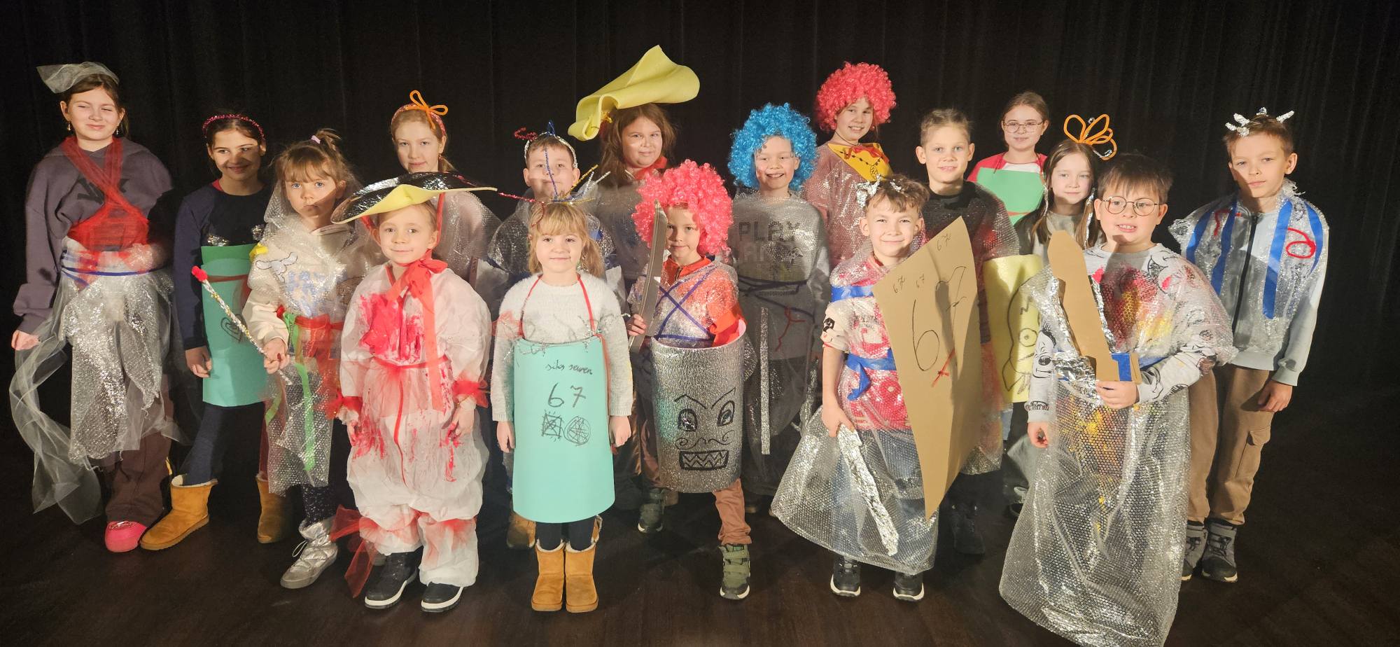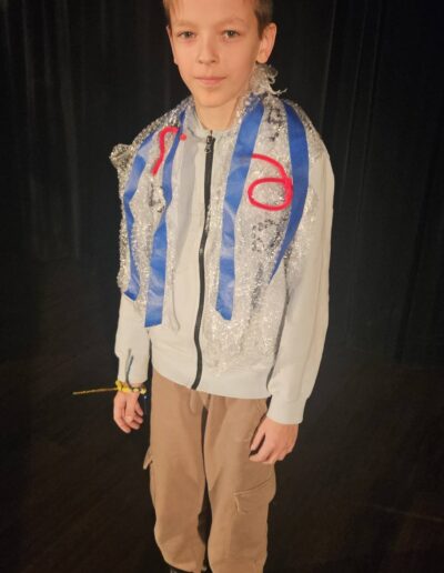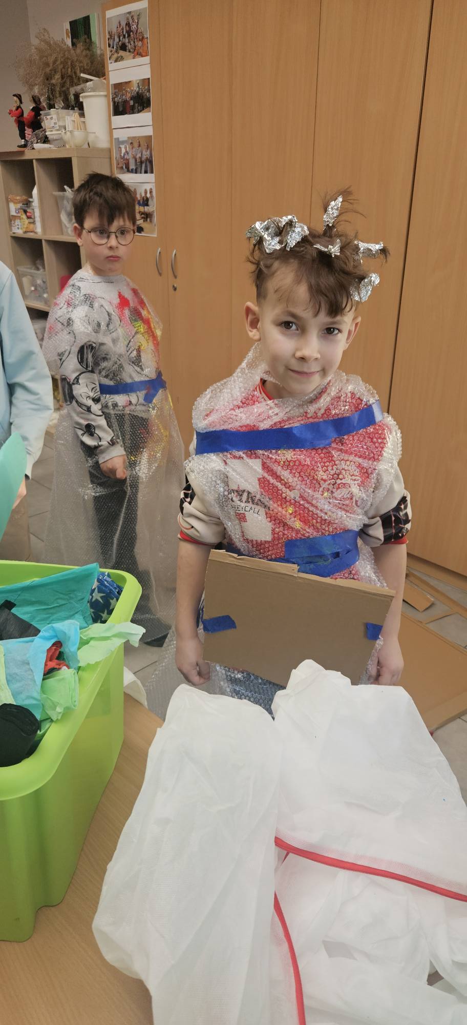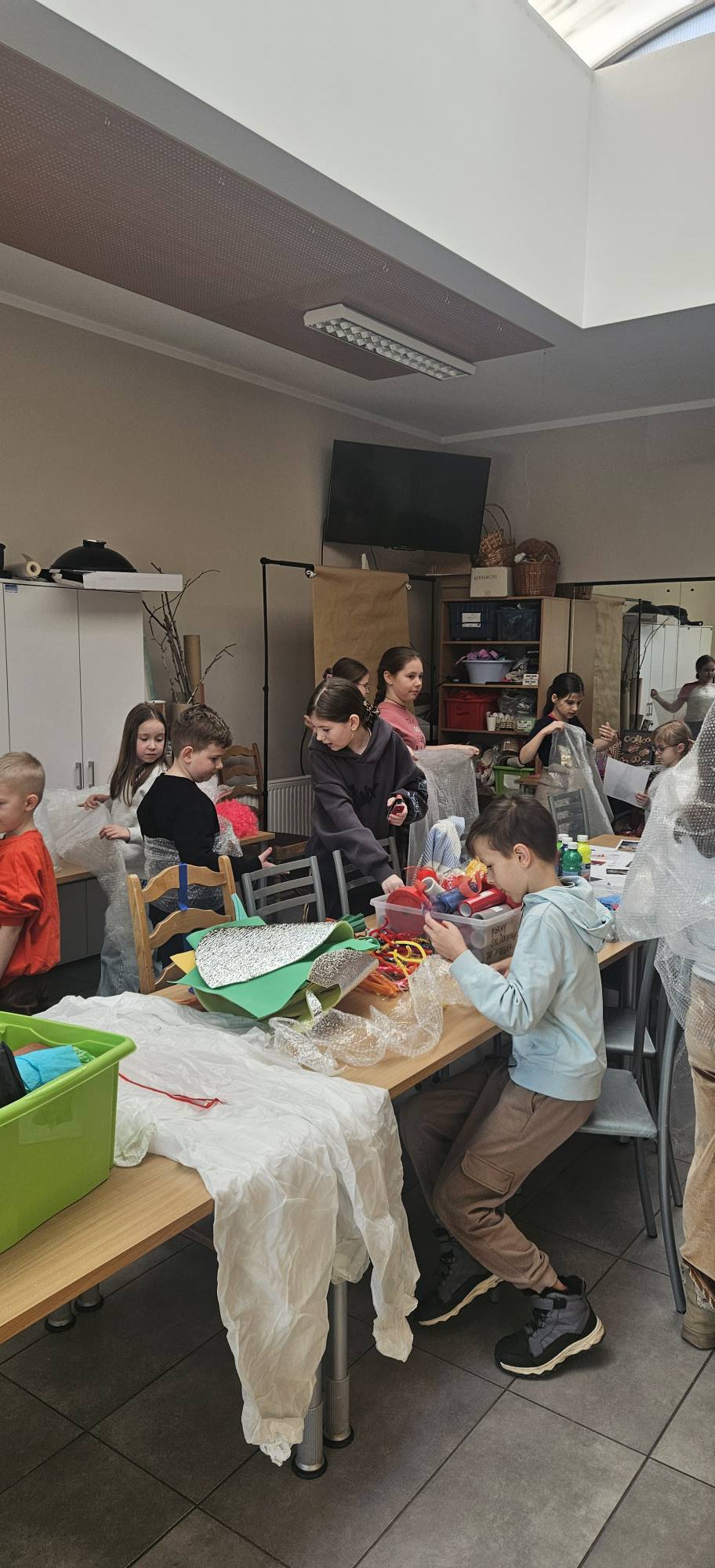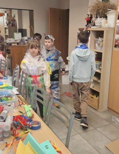Nie zabrakło też kreatywnego działania. Podczas warsztatów plastycznych dzieci tworzyły stroje, dodatki i projekty z materiałów z odzysku, poznając ideę zero waste. Było dużo śmiechu, współpracy i dumy z własnych pomysłów.