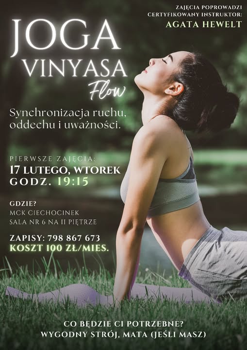 W Miejskie Centrum Kultury im. Janusza Majewskiego w Ciechocinku ruszają zajęcia Jogi Vinyasa Flow – spokojne, płynne sekwencje ruchu połączone z oddechem i uważnością. Bez presji, bez porównywania się – w swoim tempie i z troską o siebie ✨
