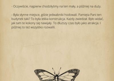 to wydarzenia które rozpoczęły się na wybranych dwóch osiedlach w Ciechocinku. Pracowaliśmy z mieszkańcami wyciągając ich z mieszkań. Zaprosiliśmy reżysera teatralnego- aktora i aktorkę-lalkarkę, którzy pracowali z mieszkańcami. Został wspólnie opracowany scenariusz, scenografia i rekwizyty wraz z dużymi postaciami, które zagrały w spektaklu. Ostatnie zajęcia zostały przeniesione do MCK gdzie połączyliśmy grupy z dwóch osiedli. W dniu finału wyszliśmy w przestrzeń miejską z pochodem teatralnym. Spektakl odbył się w trzech miejscach gdzie zdobył serca widzów, którzy tłumnie przybyli, co przerosło nasze oczekiwania, lub zatrzymywali się z ciekawością i podążali za pochodem do kolejnej sceny. Finał spektaklu odbył się przed budynkiem MCK, gdzie zagrała muzyka na żywo a mieszkańcy zostali zaproszeni do tańca.