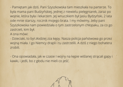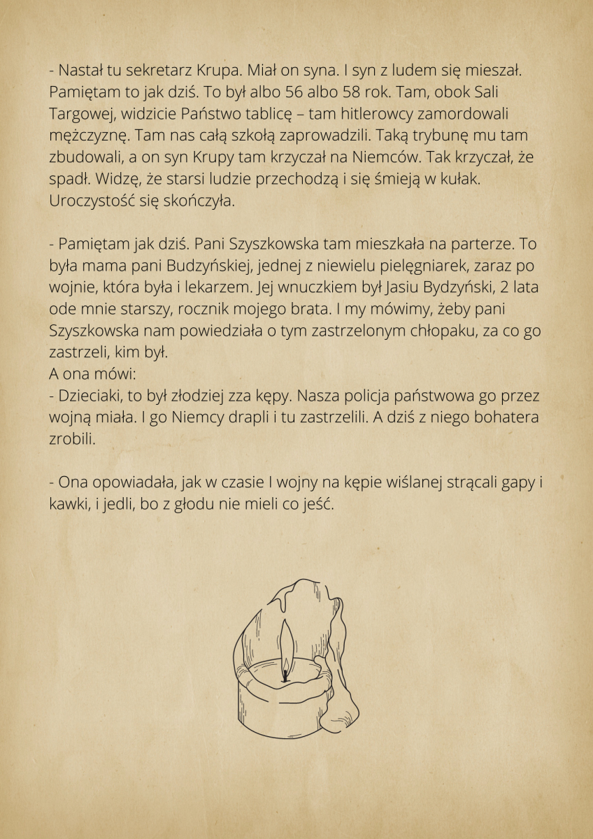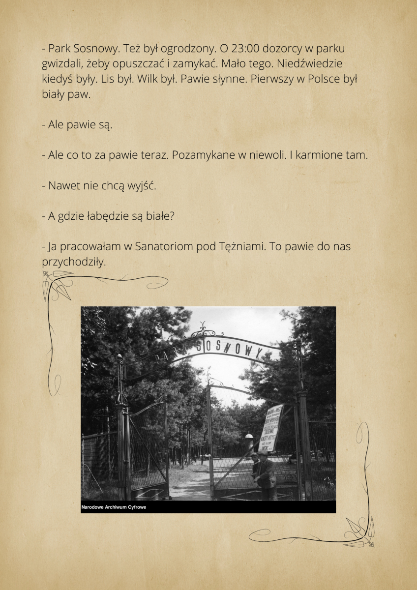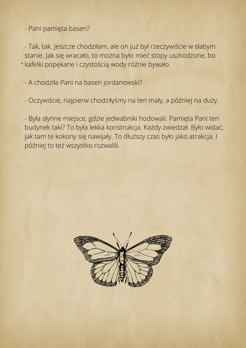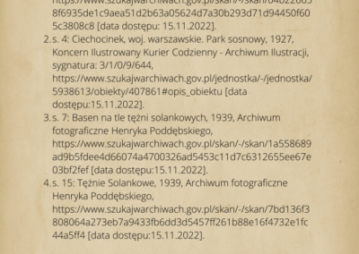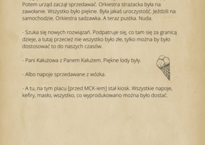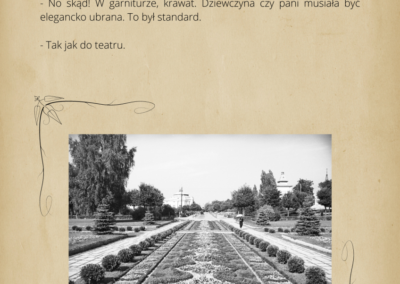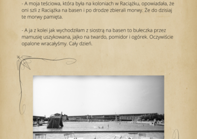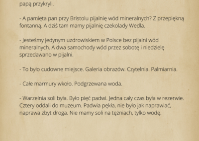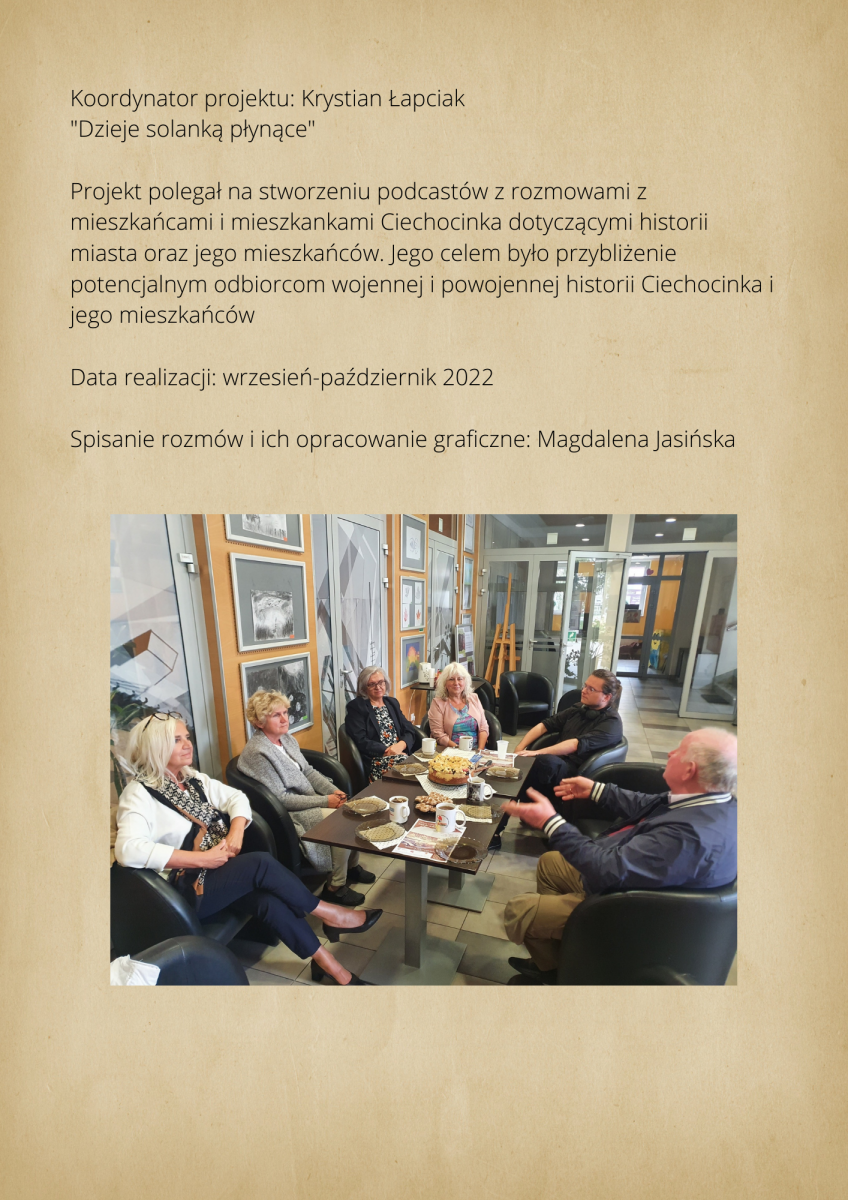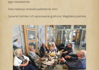 warsztaty fotograficzne, podczas których robiliśmy zdjęcia z mieszkańcami Ciechocinka. Przenieśliśmy się do XIX w w lata świetności Ciechocinka, gdzie goście jadąc do wód odwiedzali miasto i spędzali w nim swoje wakacje korzystając z uroku uzdrowiska. Mieszkańcy przebierając się w wypożyczone stroje z epoki byli fotografowani na tle architektury i przyrody. Pierwsze spotkanie fotograficzne w strojach z XIX w. miało odbyć się między blokami. Dzięki informacjom przekazanym przez mieszkańców, przenieśliśmy się na festyn rodzinny nad Wisłą, gdzie świętował cały Ciechocinek i tam pracowaliśmy ze społecznością miasta. Kolejne spotkanie w strojach odbyło się przed MCK na Skwerze Ekscentryków, gdzie fotografowaliśmy się w strojach z epoki z elementami nowoczesności. Odbyły się także spotkania gdzie pracowaliśmy na green screenie oraz w tkance miejskiej, szukając architektury XIX w. Uczestnicy zdobyli informacje o fotografowaniu portretowym, reportażowym i architektury. Podczas spotkań wykonywali swoje zdjęcia telefonami komórkowymi i zrobili portrety swoim znajomym i rodzinie. Zdjęcia zostały opracowane cyfrowo, postarzone i wywołane w technice odwołującej się do sepii. Na wystawie zostało pokazane 30 zdjęć. Uczestnicy otrzymali pamiątkowe zdjęcia swoich portretów.