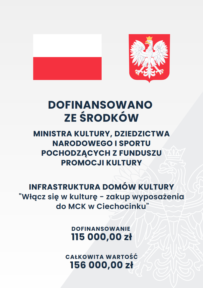 Miejskie Centrum Kultury w Ciechocinku realizuje zadanie „Włącz się kulturę – zakup wyposażenia do MCK w Ciechocinku” w ramach Programu Rządowego „Infrastruktura domów kultury” ze środków finansowych Ministra Kultury i Dziedzictwa Narodowego pochodzących z Funduszu Promocji Kultury. Na realizację zadania otrzymał dofinansowanie w wysokości 156 000 zł.